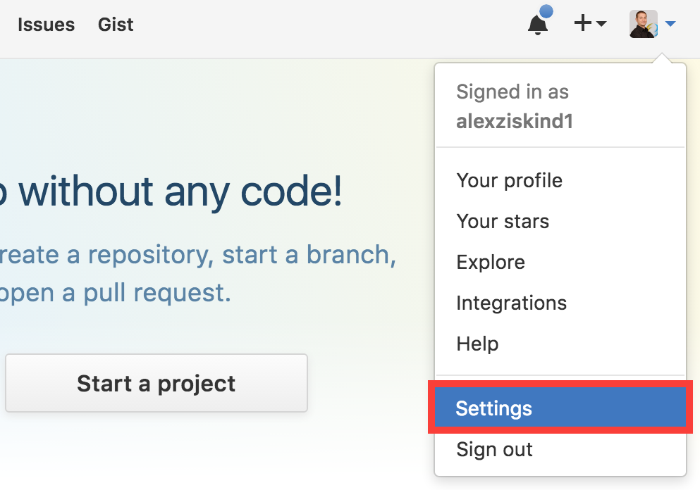 Go to your GitHub account, then find “Settings” in the dropdown that has your picture