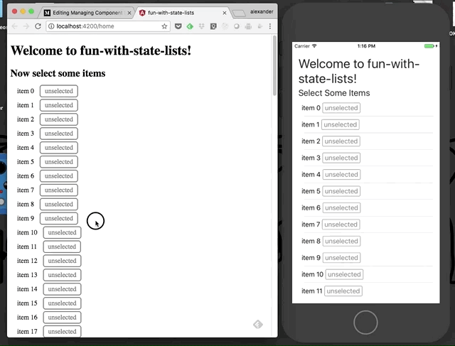 Note: The web templates still uses ngFor. It works perfectly with the stateless version of ItemComponent. Here is the branch in the repo: list-view-state-in-model branch.