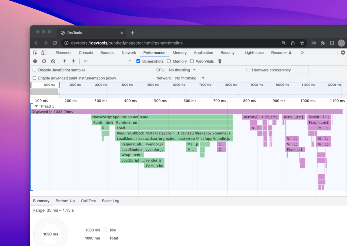 With 8.5 we are now automatically generating a Chrome DevTools compatible json file whenever you have profiling: 'timeline' enabled in your nativescript.config.ts.