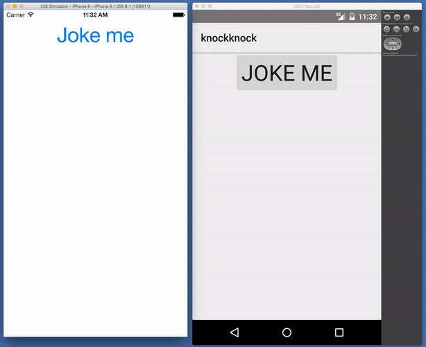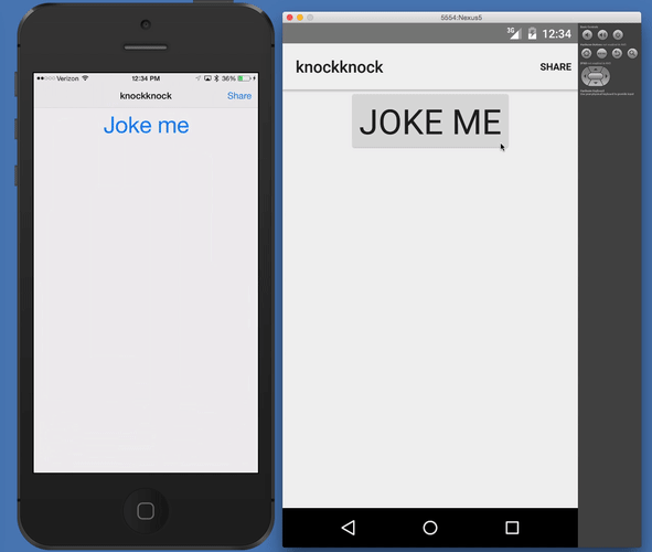 <!-- main-page.xml --><Page loaded="loaded"> <Page.actionBar> <ActionBar title="knockknock"> <ActionBar.actionItems> <ActionItem text="Share" tap="share" ios.position="right" /> </ActionBar.actionItems> </ActionBar> </Page.actionBar> <StackLayout> <Button text="Joke me" tap="generateJoke" /> <Label text="{{ joke }}" textWrap="true" /> <Label text="{{ timestamp }}" cssClass="red" /> </StackLayout></Page>