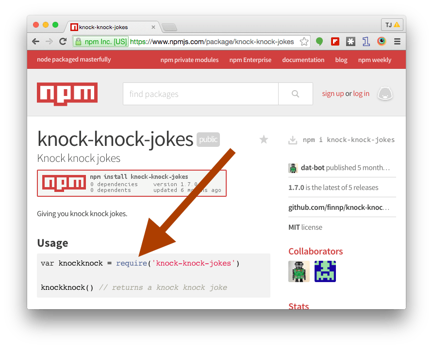 To use an npm module all you need to do is require() it and use its documented API. The string to pass require() is usually the module name, and is also usually documented on the module's page. For example here's where it's documented on the knock knock jokes repo: