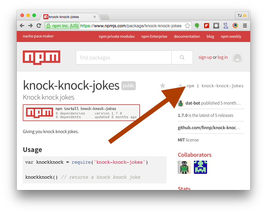 $ npm install knock-knock-jokes --save